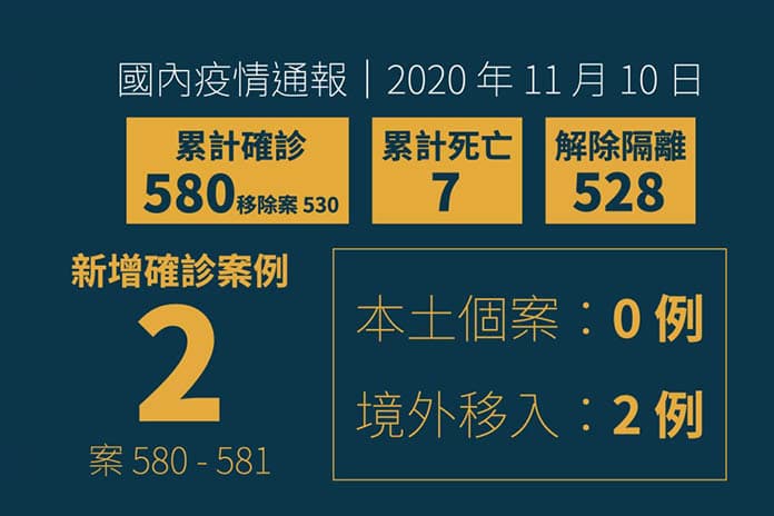 中央流行疫情指揮中心11月10日公布台灣新增2例境外移入COVID-19武漢肺炎病例(案 580、581),均為來台工作之 30 多歲印尼籍女性。