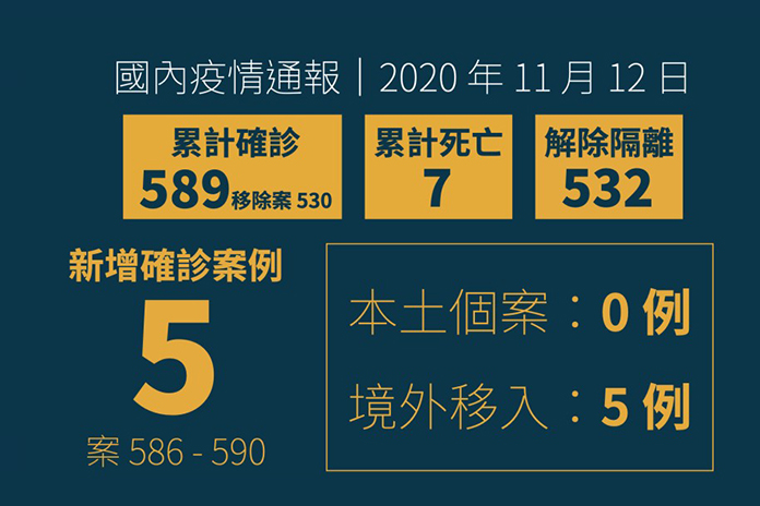 中央流行疫情指揮中心11月12日公布台灣新增5例境外移入COVID-19武漢肺炎確定病例(案 586 至 590),均為來台工作之20多歲至30多歲印尼籍女性移工。