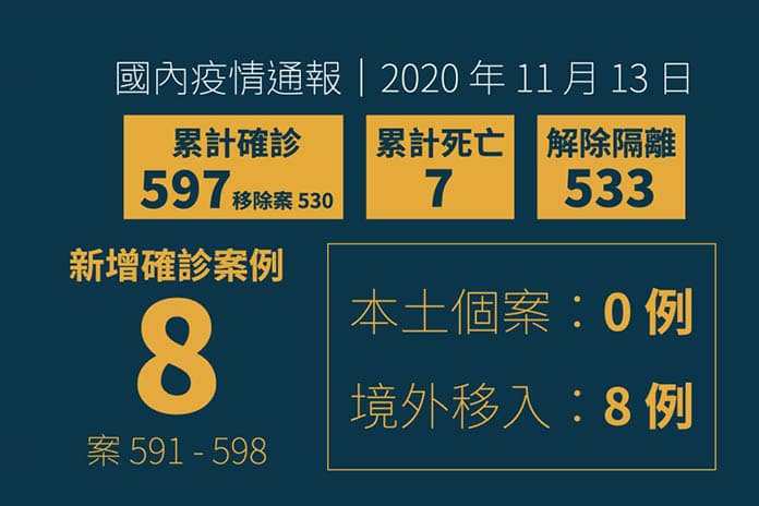 中央流行疫情指揮中心11月13日公布國內新增8例境外移入COVID-19武漢肺炎確定病例(案591至598),分別自菲律賓(5例)、印尼(2例)及波蘭(1例)入境。