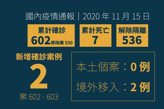 中央流行疫情指揮中心11月15日公布,台灣新增2例境外移入COVID-19武漢肺炎確定病例(案602、603),分別自日本及美國入境。