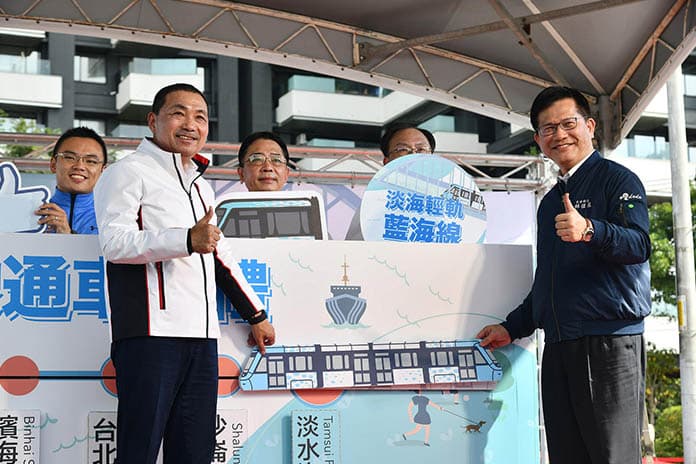 北市政府於11月15日於淡水漁人碼頭舉行「淡海輕軌第一期藍海線通車典禮」,由新北市長侯友宜及交通部長林佳龍共同主持通車儀式。新北市長侯友宜致詞時表示,未來淡海輕軌第二期及2024年淡江大橋完工後,串連規劃中的八里輕軌路網,淡海地區將成為北台灣最受矚目觀光焦點,同時順勢向中央喊話,盼交通部支持新北市地方交通建設,並宣布淡海輕軌藍海線於下午2點正式通車。