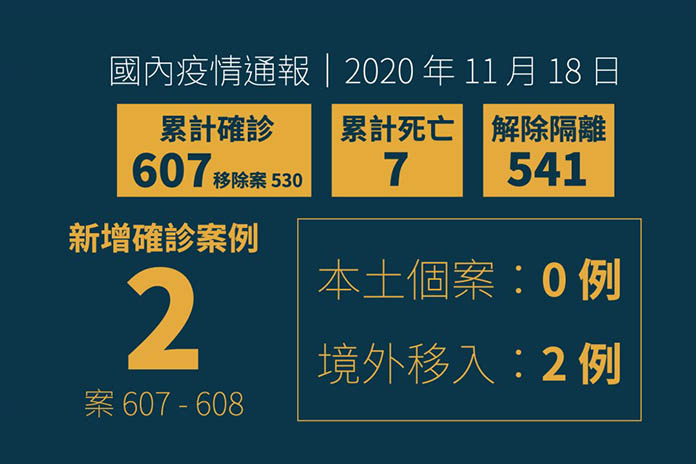 中央流行疫情指揮中心11月18日公布台灣新增2例境外移入COVID-19武漢肺炎確定病例,為30多歲印尼籍女性(案607)及60多歲本國籍男性(案608),分別自印尼、美國入境。