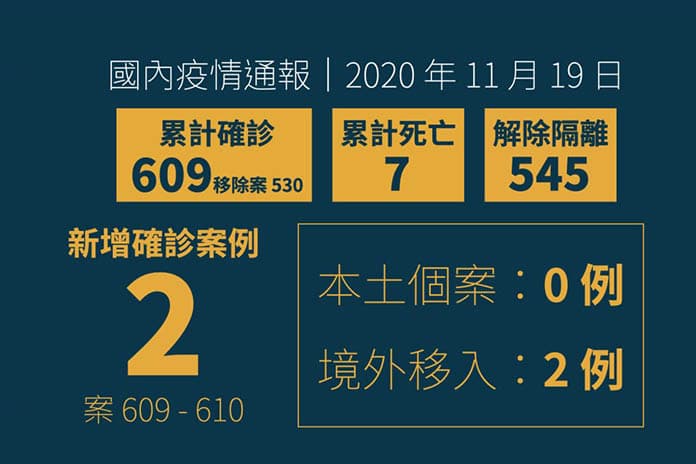 中央流行疫情指揮中心11月19日公布台灣新增2例境外移入COVID-19武漢肺炎確定病例,分別為土耳其籍20多歲女性(案609)及印尼籍20多歲女性(案610)。