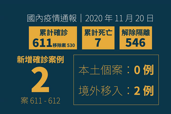 中央流行疫情指揮中心11月20日公布台灣新增2例境外移入COVID-19武漢肺炎確定病例(案611、612),均為印尼籍30多歲女性移工。