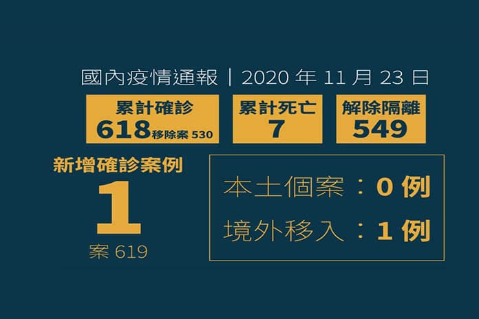 央流行疫情指揮中心11月23日公布台灣新增1例境外移入COVID-19武漢肺炎確定病例,為本國籍50多歲男性(案619),自迦納確診病重後,緊急以國際救援醫療專機送返回台。