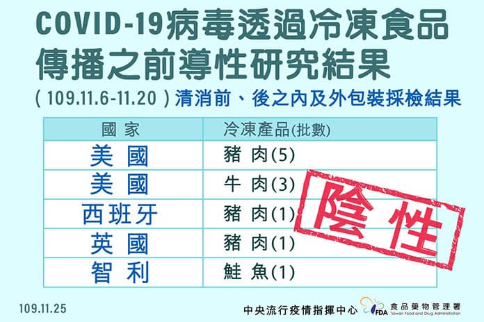 福部食藥署於2020年11月6日至20日在邊境採樣檢驗進口冷凍食品之內外包裝,監控進口冷凍食品內、外包裝之病毒污染狀況及消毒作業效果評估,共抽驗4個國家之輸入豬肉、牛肉及鮭魚,共11批產品,就其外包裝、內包裝,在消毒前、消毒後分別取樣,共44個樣品,COVID-19病毒核酸檢驗結果皆為陰性。