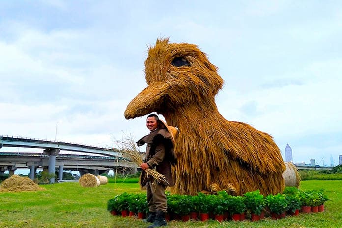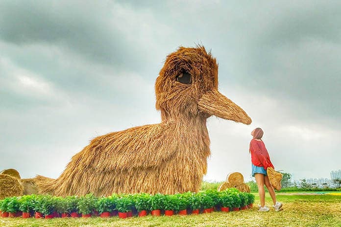 帶著愉快的心情,跟隨著三重河濱公園迎風的步伐四處溜逛,寬廣地景大型手工藝-稻草鴨與穀倉鴨舍,對應周邊環境樹木吐露清新,空氣中瀰漫著稻草香氣,更增添了濃濃的農村味。