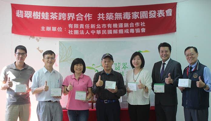 北輔導有限責任新北市有機運銷合作社與中華民國解癮戒毒協會合作推出「翡翠樹蛙茶」有機茶新包裝,跨界合作,共同推廣健康又好喝有機茶,打造無毒家園。
