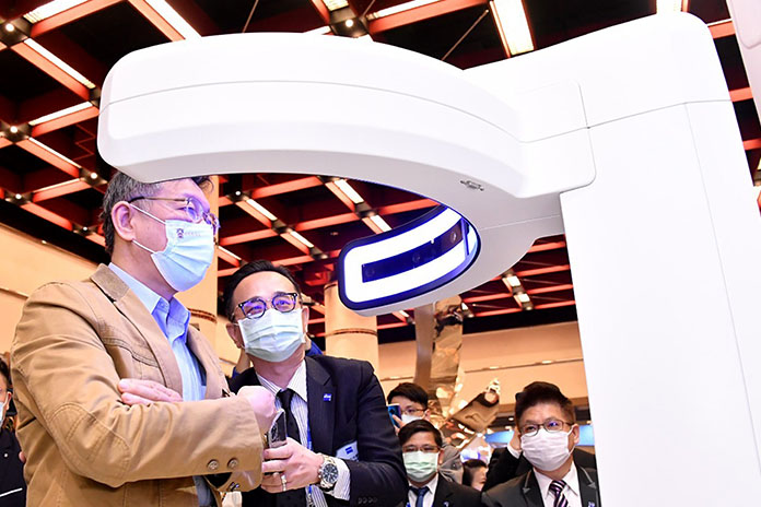 致詞結束後,柯文哲前往會場中的各攤位參觀今年年會的論文發表內容,也體驗了3D中心定位儀如何提高定位眼位的準度。