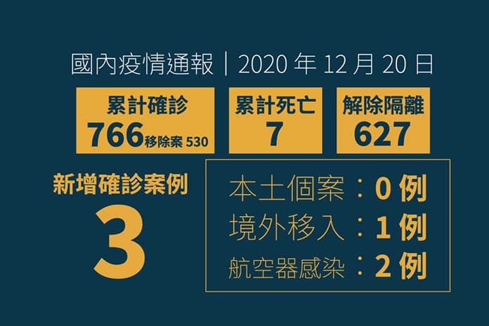 *12月20日公布台灣新增3例COVID-19確定病例,2名為12月18日公布之案760同事(案765、766),1名為自印尼入境船員(案767)。