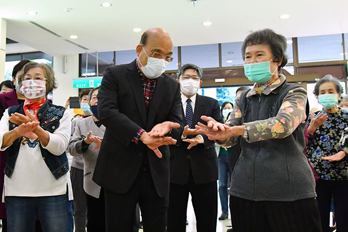 政院長蘇貞昌今(16)日拜訪位於新北市三芝區的「雙連安養中心」,在年節將近時向長者拜早年,說聲「恭喜新年好」!蘇院長不但熱情與長者們一起做「十巧手」早操,還帶來泡芙與福袋當伴手禮贈與長者們。院長也帶來蔡英文總統「長照2.0升級」的政策大紅包,蔡總統上任以來,大幅增加長照服務與預算,今(110)年已有529億元,持續推動政策感謝長者們對臺灣的付出。