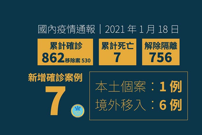 *1月18日公布台灣新增6例境外移入COVID-19武漢肺炎確定病例(案857至862),分別自美國、英國、菲律賓及緬甸入境。另外,公布新增1例本土COVID-19確定病例(案863) 。