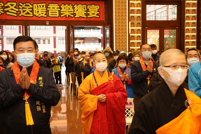 末天寒,佛光山三峽金光明寺連續第7年舉辦寒冬送暖音樂饗宴,為達到防疫的要求,金光明寺在大雄寶殿外,另外加開4樓大會議室,以拉大福田戶的間距,並全程配戴口罩。參與的近千戶每戶獲福田金2,000元,以及油、米、棉衣等民生物資福袋。新北市副市長謝政達、社會局副局長許秀能等到場,感謝佛光山長年的慈悲和愛心。