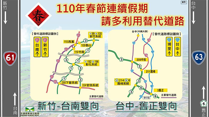 另連假期間,建議北部往返中南部民眾,可改走台61快速公路,不僅免費又快速;高公局特別提醒用路人國3西濱北向入口,於春節連假之2月14、15日全日封閉,民眾可續行台61至國3香山交流道再進入高速公路,大家做好分流,就能避開塞車(詳附圖1)。高公局預祝大家春節假期愉快、行車平安。