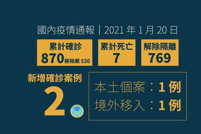 另外,指揮中心1月20日也再公布,臺灣新增1例境外移入COVID-19武漢肺炎確定病例(案871),為本國籍20多歲女性,於2019年12月前往西班牙訪友,今2021年1月8日返臺,持有搭機前3日內檢驗陰性報告,入境後至住處居家檢疫。