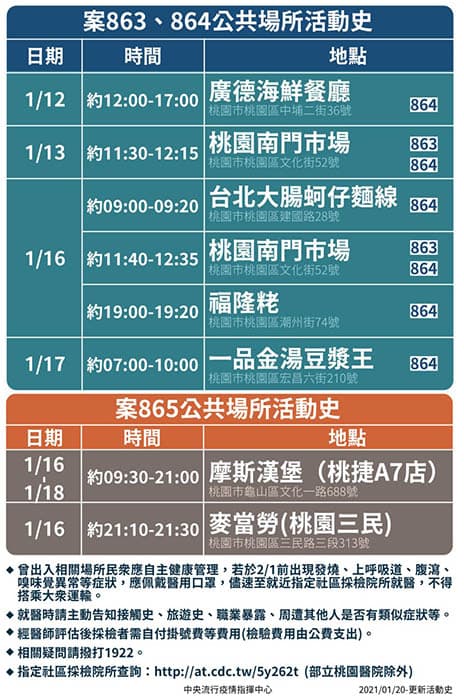 另針對案863、864及865家庭群聚,指揮中心1月20日再公布個案之其他公共場所活動史,提醒曾於所列時段出入相關場所的民眾,請自主健康管理,於2月1日前,如出現疑似症狀,應確實佩戴醫用口罩,就近至指定社區採檢院所就醫,且不得搭乘大眾交通運輸工具;就醫時請主動告知接觸史、旅遊史、職業暴露及身邊是否有其他人有類似症狀,經醫師評估後採檢者需自付掛號費等費用(檢驗費用由公費支出);返家後亦應佩戴口罩避免外出,與他人交談時應保持1公尺以上距離。