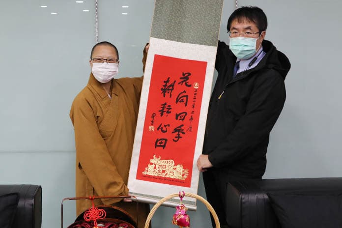 光山南台別院為慶祝農曆12月8日的佛陀成道日,特準備佛粥(臘八粥),除在道場供應禮佛信眾外,還分送政府機關、公司行號、弱勢團體等單位,而1月20日南台別院的滿舟住持特別分享供佛的臘八粥,親送至台南市政府永華市政中心,台南市長黃偉哲也親自接待,滿心歡喜的品嚐臘八粥,並且也立刻將臘八粥親手發送給市政府的員工和洽公的民眾,讓民眾一同沐浴在佛陀的法喜之下。
