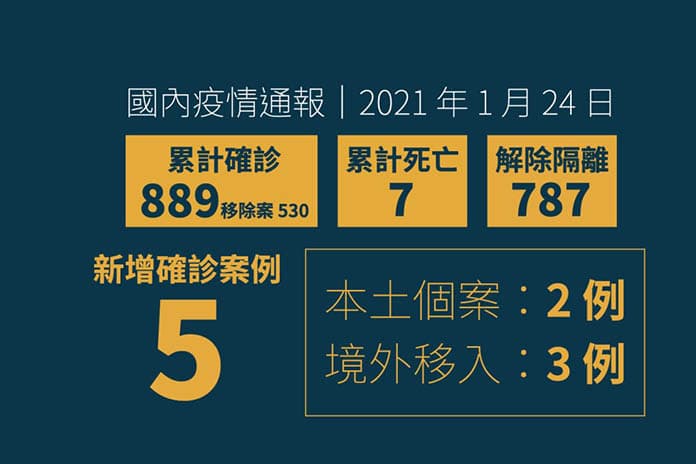 球直到2021年1月24日為止,COVID-19武漢肺炎確診數統計數據顯示,已飆速達到9,867萬1,668人,死亡為212萬5,009人。中央流行疫情指揮中心1月24日公布臺灣新增3例境外移入COVID-19武漢肺炎確定病例,分別自南非(案886)、美國(案887、888)入境。另外再公布,新增2例本土確定病例,1人為該院出院病患(案889),另1人為該案889之同住家人(案890)。