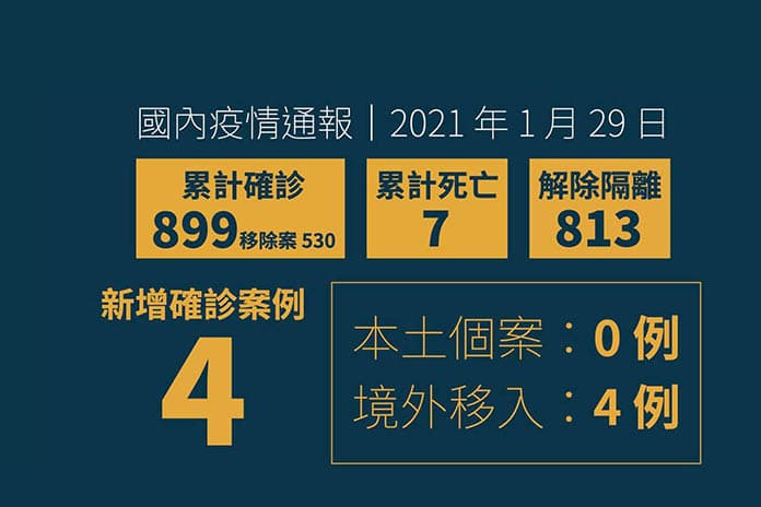 球直到2021年1月29日為止,COVID-19武漢肺炎確診數統計數據顯示,飆速達到1億136萬6,952人,死亡為219萬4,576人。中央流行疫情指揮中心1月29日公布臺灣新增4例境外移入COVID-19武漢肺炎確定病例,分別自菲律賓(案897至899)及南非(案900)入境。