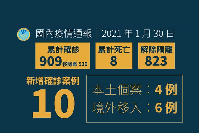 *1月30日公布臺灣新增6例境外移入COVID-19確定病例,分別自印尼(案901)、捷克(案902)及巴西(案903至906)入境。並公佈新增4例本土確定病例,均為醫院感染事件之確診個案接觸者,其中3例為案863之同住家人(案907、909、910),研判與案 863、864、865 為一起家庭群聚案;另1例為案889之就醫相關接觸者(案 908)。