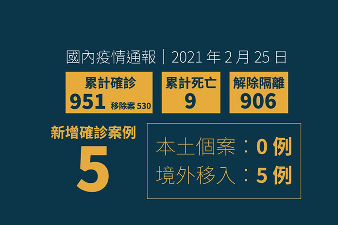 球直到2021年2月25日為止,COVID-19武漢肺炎確診數統計數據顯示,已速飆達到1億1千245萬1,388人,死亡為250萬2,551人。臺灣中央流行疫情指揮中心2月25日公布新增5例境外移入COVID-19確定病例(案948至952),均為菲律賓籍女性移工,年齡介於20多歲至30多歲,今2021年2月3日搭乘同班機來臺工作,皆持有搭機前3日內檢驗陰性報告,入境時無症狀,並至集中檢疫所檢疫。