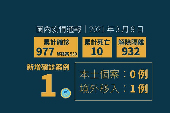 球直到2021年3月9日為止,COVID-19武漢肺炎確診數統計數據顯示,已飆升達到1億1千709萬760人,死亡為260萬7,619人。臺灣中央流行疫情指揮中心3月9日日公布新增1例境外移入COVID-19確定病例(案978),為本國籍30多歲女性,2019年5月至宏都拉斯工作,今2021年1月即有鼻塞症狀,1月6日於當地確診COVID-19後,於住處隔離至2月19日,期間曾分別於1月16日、1月18日、2月8日及2月17日進行採檢,結果皆為陰性。