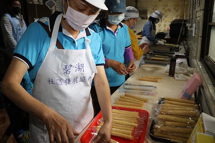 吳文彩帶領志工吳肖蓮、黃玉秋、李金蘭、鄭淑梅、楊阿照等銀髮長輩一起烘製蛋捲,吳文彩說,總覺得蛋捲要有網狀呈現才到位,幾經研究調和材料比例,終獲成功,吃過的人都稱讚比市售蛋捲更香脆可口,微甜而不膩,配上碧湖烘焙的咖啡,可謂人間美味,一盒15條只賣200元,必須預約訂製,所得盈餘充作社區長輩共餐之用。
