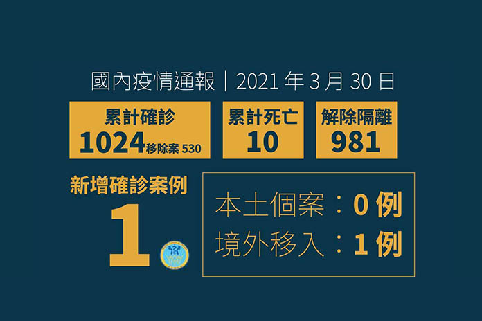 球直到2021年3月30日為止,COVID-19武漢肺炎確診數統計數據顯示,已飆升達到1億2千743萬8,143例,死亡為279萬9,804例。臺灣中央流行疫情指揮中心3月30日公布新增1例境外移入COVID-19確定病例(案1025),為本國籍30多歲女性,2019年9月至英國就學,今2021年3月28日返臺,持有搭機前3日內檢驗陰性報告,入境時無症狀,並至集中檢疫所檢疫。