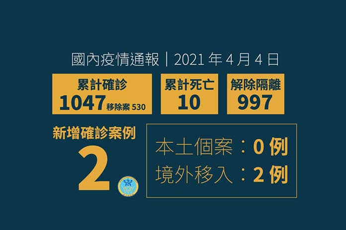 球直到2021年4月4日為止,COVID-19武漢肺炎確診數統計數據顯示,已飆升達到1億3千51萬648例,死亡為285萬4,150例。臺灣中央流行疫情指揮中心4月4日公布新增2例境外移入COVID-19確定病例,分別自印尼(案1047)及菲律賓(案1048)入境。