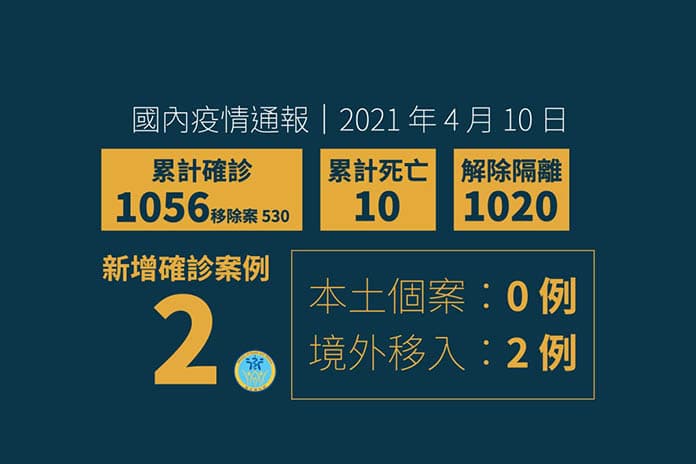 球直到2021年4月10日為止,COVID-19武漢肺炎確診數統計數據顯示,已飆升達到1億3千438萬3,961例,死亡為292萬3,398例。臺灣中央流行疫情指揮中心4月10日公布新增2例境外移入COVID-19確定病例,分別自印尼(案1056)及菲律賓(案1057)入境。