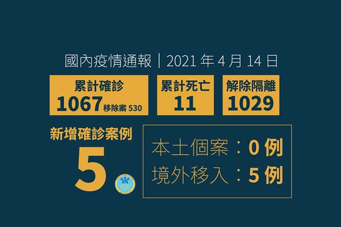 球直到2021年4月14日為止,COVID-19武漢肺炎確診數統計數據顯示,已飆升達到1億3千706萬9,553例,死亡為296萬6,206例。臺灣中央流行疫情指揮中心4月14日公布新增5例境外移入COVID-19確定病例,自菲律賓(案1064、1065)、俄羅斯(1066)、英國(案1067)及加拿大(案1068)入境。