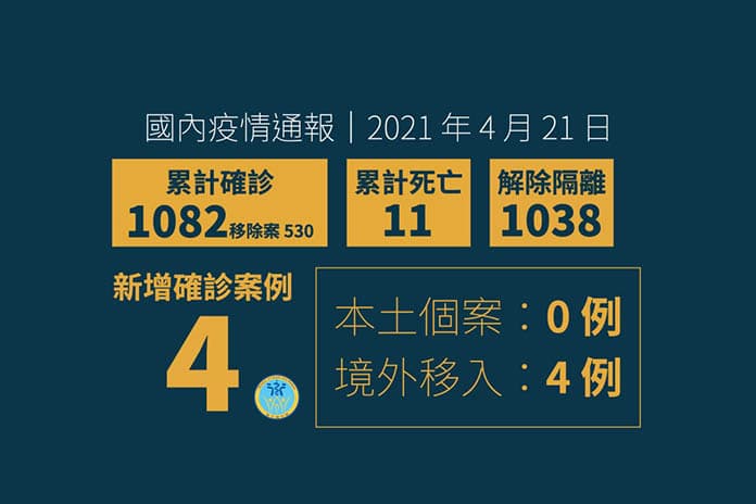 臺灣中央流行疫情指揮中心4月21日公布新增4例境外移入COVID-19確定病例,自斯洛伐克(案1080)、印尼(1081)及菲律賓(案1082、1083)入境。