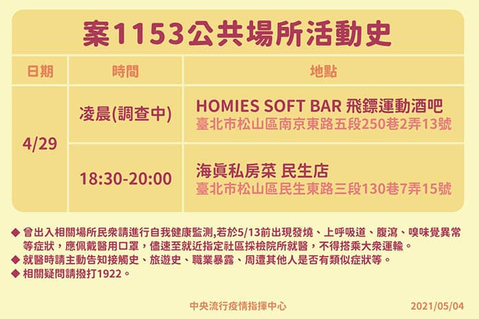 *案1153可傳染期間曾有公共場所活動史,提醒曾於所列時間及場所活動的民眾,進行14天自我健康監測。