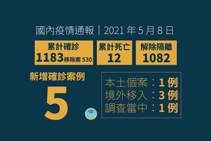 臺灣中央流行疫情指揮中心5月8日公布新增3例境外移入COVID-19確定病例,自菲律賓(案1180及案1181)、荷蘭(案1182)入境。另外新增1例感染源調查中COVID-19病例,為某航空公司機師(案1183),及1例本土COVID-19病例(案1184),為1183之同住家人。