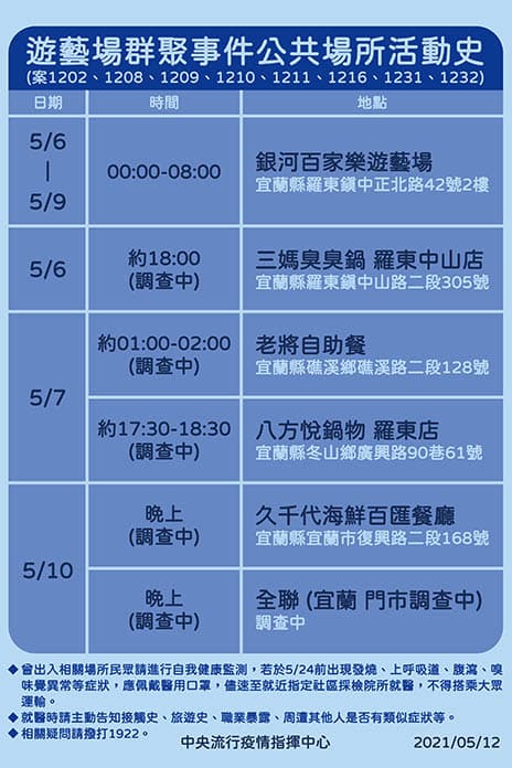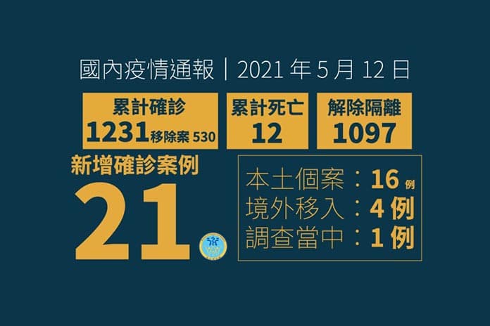 臺灣中央流行疫情指揮中心5月12日公布新增4例境外移入COVID-19確定病例,自菲律賓(案1212至案1214)及印度(案1215)入境。另外新增16例本土及1例調查中COVID-19確定病例,皆為本國籍。16例本土個案中,3例為宜蘭遊藝場群聚個案之相關接觸者(案1216、案1231、案1232),10例為案1203接觸者(案1218、案1219,案1223至案1230),3例感染源待釐清(案1217、案1220、案1221);1例調查中個案為案1187接觸者(案1222)。