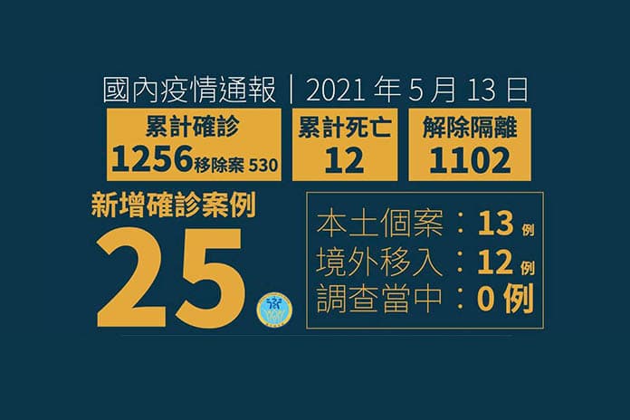 臺灣中央流行疫情指揮中心5月13日公布新增12例境外移入COVID-19確定病例,自菲律賓(案1233至案1236、案1238)、印度(案1239至案1244)及烏干達(案1237)入境。另外新增13例本土COVID-19確定病例(案1245至案1257),均為本國籍。其中9例與案1203群聚相關,3例與臺北市萬華區茶藝館群聚相關,1例感染源待釐清。