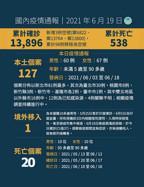 6月19日新增之127例本土病例,為60例男性、67例女性,年齡介於未滿5歲至90多歲,發病日介於今2021年6月3日至6月18日。個案分佈以新北市81例最多,其次為臺北市30例,桃園市8例,新竹縣3例,新竹市、基隆市各2例,臺中市1例。其中雙北地區以外縣市16例中,12例為已知感染源、4例關聯不明;相關疫情調查持續進行中。