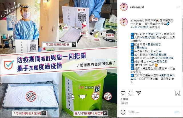 在創業的路上我也掛念著父親的叮嚀,一步步實踐中。所以自(COVID-19)新冠肺炎/武漢肺炎/新型冠狀病毒疫情爆發以來,愛爾麗醫療集團便捐贈了100套防護衣含護目鏡及口罩予移民官,協助防疫工作及維護第一線查驗人員安全捐贈160支額溫槍給台南市警局執勤員警。以及撥列預算320萬,在新北新店地區捐贈一台救護車,包含了內部設備(如一般的氧氣設備、燒傷處理及自動體外心臟去顫器等)。並於2020年9月5日,愛爾麗國際醫療集團聯合台南市政府舉辦「感謝有你 防疫公益演唱會」,門票收入全數捐助台南警消醫護單位。