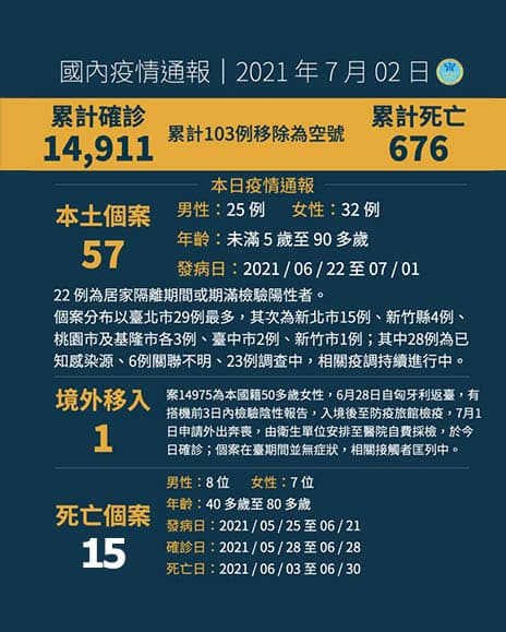 7月2日新增之57例本土病例(其中22例為居家隔離期間或期滿檢驗陽性者),為25例男性、32例女性,年齡介於未滿5歲至90多歲,發病日介於今2021年6月22日至7月1日。個案分布以臺北市29例最多,其次為新北市15例、新竹縣4例、桃園市及基隆市各3例、臺中市2例、新竹市1例;其中28例為已知感染源、6例關聯不明、23例調查中,相關疫情調查持續進行中。