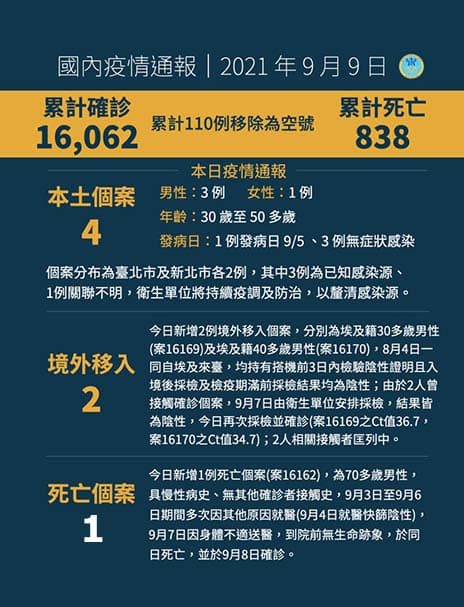 9月9日新增4例本土病例中,為3例男性、1例女性,年齡介於30歲至50多歲,其中1例發病日為今2021年9月5日、餘3例為無症狀感染;個案分布為臺北市及新北市各2例,其中3例為已知感染源、1例關聯不明,衛生單位將持續進行疫情調查及防治,以釐清感染源。