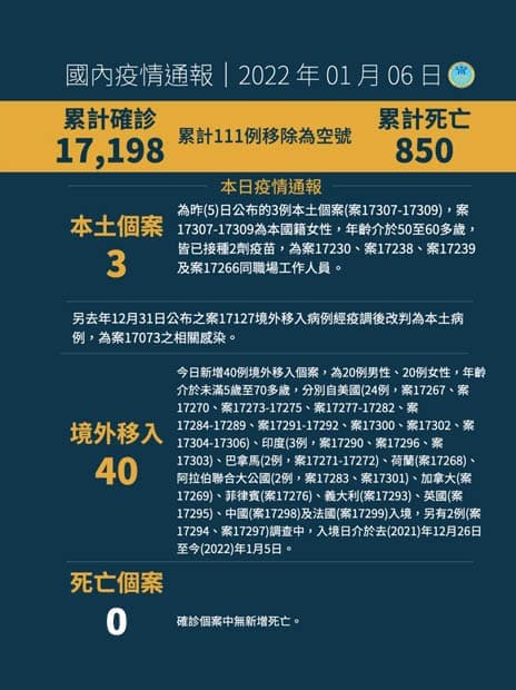 1月6日新增40例境外移入個案,為20例男性、20例女性,年齡介於未滿5歲至70多歲,分別自美國(24例,案17267、案17270、案17273-17275、案17277-17282、案17284-17289、案17291-17292、案17300、案17302、案17304-17306)、印度(3例,案17290、案17296、案17303)、巴拿馬(2例,案17271-17272)、荷蘭(案17268)、阿拉伯聯合大公國(2例,案17283、案17301)、加拿大(案17269)、菲律賓(案17276)、義大利(案17293)、英國(案17295)、中國(案17298)及法國(案17299)入境,另有2例(案17294、案17297)調查中,入境日介於去2021年12月26日至今2022年1月5日。