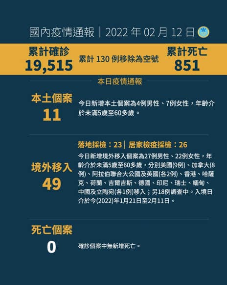 2月12日新增境外移入49例,個案為27例男性、22例女性,年齡介於未滿5歲至60多歲,分別美國(9例)、加拿大(8例)、阿拉伯聯合大公國及英國(各2例)、香港、哈薩克、荷蘭、吉爾吉斯、德國、印尼、瑞士、緬甸、中國及立陶宛(各1例)移入;另18例調查中。入境日介於今2022年1月21日至2月11日。