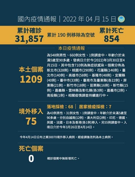 指揮中心表示,4月15日新增1209例本土病例,為548例男性、660例女性、1例調查中,年齡介於未滿5歲至90多歲,發病日介於今2022年3月30日至4月15日,其中包含710例為無症狀感染。個案分佈為新北市(328例),桃園市(290例),花蓮縣(146例),臺北市(140例),高雄市(58例),基隆市(48例),宜蘭縣(40例),臺中市(33例),臺南市及臺東縣(各22例),屏東縣(21例),新竹市(18例),苗栗縣(16例),新竹縣(15例),嘉義縣、雲林縣及彰化縣(各3例),嘉義市(2例),南投縣(1例)。相關疫情調查持續進行中。