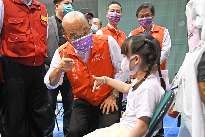 蘇貞昌上午赴基隆視察國小學童疫苗注射,受訪時被問及總統臉書寫兒童疫苗涵蓋率74.2%,兩者差異甚大,蘇答:確診以後就會有抗體,且對於所有的兒童疫苗、各種疫苗量都很足夠,而現在學校也都恢復了實體上課,也都回歸校園施打,「我們今天就特別來基隆來看校園施打的情形,同時我們也藉這個機會感謝地方政府、感謝教育部、感謝學校,包括第一線的醫護工作同仁,大家辛苦了」。