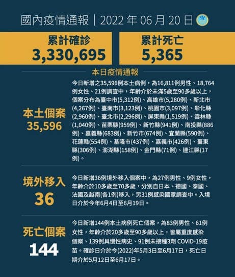 臺灣中央流行疫情指揮中心6月20日公布新增35,632例COVID-19確定病例,分別為35,596例本土個案及36例境外移入;另確診個案中新增144例死亡。