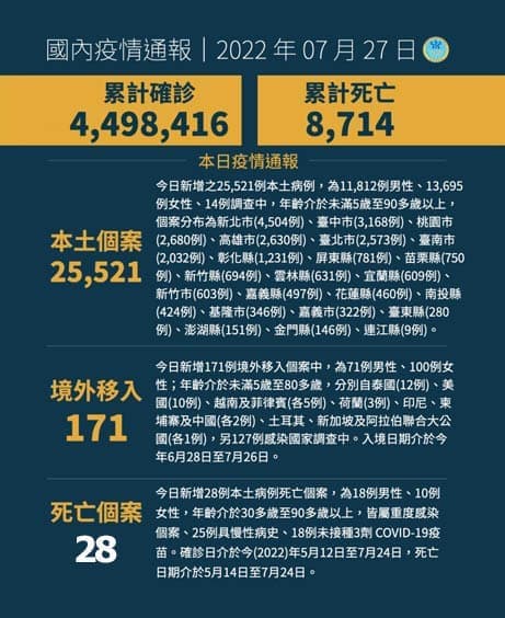 臺灣中央流行疫情指揮中心7月27日公布新增25,692例COVID-19確定病例,分別為25,521例本土個案及171例境外移入;另確診個案中新增28例死亡。