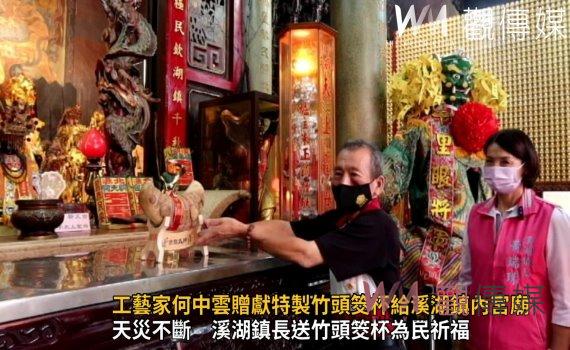 (彰化新聞)【記者陳雅芳/彰化報導】武漢肺炎疫情造成民眾不安與恐慌,近日颱風、地震接續發生,東部地區飽受天災肆虐的畫面,透過各種媒體傳來,讓人看得怵目驚心;溪湖鎮雖無災情傳出,但本於同胞情誼,溪湖鎮長黃瑞珠今(19)日將台灣工藝家何中雲所贈的一批大型竹頭筊杯,轉贈給鎮內33家宮廟,一同祈求風調雨順、國泰民安。
