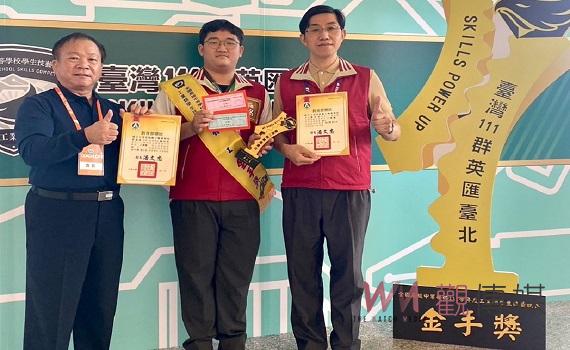 ▲北農111年全國技藝競賽農機科鄭楷智獲金手獎第二名(左起楊長鉿校長鄭楷智同學凃伊駿老師。