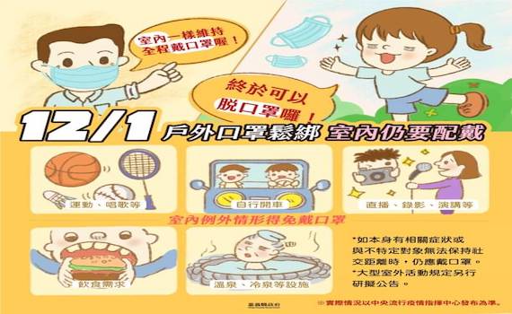 衛生局長趙紋華表示,自12月1日起,將放寬戴口罩防疫措施,室外環境取消應全程佩戴口罩規定,惟歲末與跨年大型戶外活動是否戴口罩?將由指揮中心另行研議,餐飲場所亦取消宴席不得逐桌敬酒敬茶規定;另提醒有慢性病或呼吸道症狀的民眾,於人潮密集處,仍建議戴口罩。