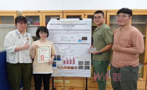 材料系四年級的林耘均表示,鈦金屬是重要且常見的生醫材料,但鈦金屬缺乏抗菌能力,實驗室希望透過鍍膜來改善這個缺點,提供大眾更優質的醫材選擇,在廖淑娟老師的指導下,投入「微弧氧化法製備含鋅塗層與後處理創造功能性表面促成骨活性及抗菌性能的影響」研究。